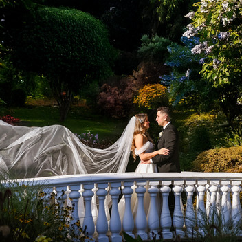After the ceremony, we explored the property for portraits. First, we photographed on the white bridge. Next, we moved into the gardens. Finally, we ended near views that stretch toward the vineyards.