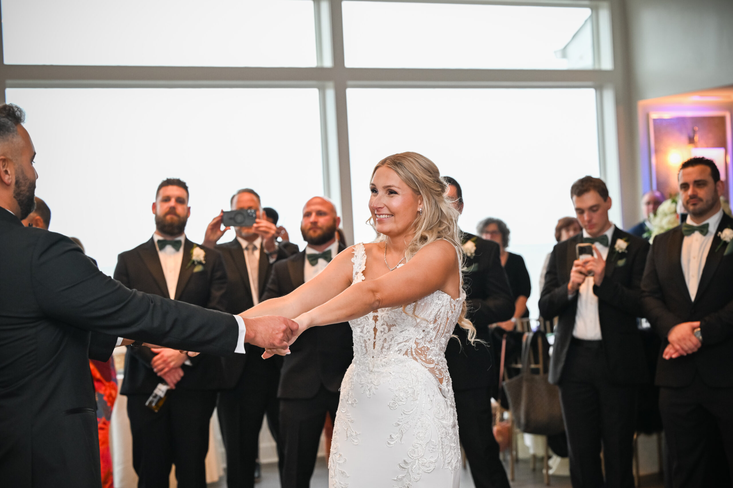 After cocktail hour concludes, guests transition into The Piermont’s elegant ballroom. Floor-to-ceiling windows allow natural light during the early evening, while reception lighting creates warmth as the celebration continues.